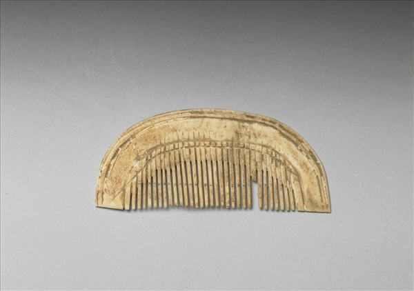 全器半月形器之背寬大致相同,兩端平直,梳齒長度由中央向兩側依序遞減,梳背外緣陰刻兩道弦紋為飾,齒與背之間陰刻二道弦紋間隔。一根梳齒殘缺。全器並不平整,製作工藝樸拙。