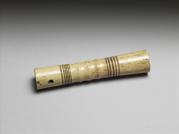 長管形中有一孔貫穿,乃兩面對穿而成,較細的一端孔呈圓形,另一端呈三角形。呈圓形者之內壁仍遺留當時鏇孔時之寬弦紋;呈三角形者可看出當時鑽孔時先從三角點鑽入,再修磨出孔壁。近較細的一端兩側各穿一孔,可供固定中孔內物質,外壁中段有四道寬凹痕,其近較細之ㄧ端陰刻六道細弦紋為飾,另一端飾五道較寬弦紋。此器之中孔可供插入一物,再藉壁面之兩個成直線的小孔固定之。手握之,外壁中段之凹痕可供執握,可能為器柄類物。