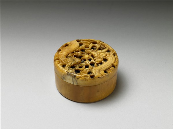 圓盒,子母口,平底,蓋與盒身分由兩塊象牙製成,蓋面高浮雕雙龍戲珠紋,頭向相反,蓋緣有傷缺填補與傷璺,全器因長期盤玩使用,已呈牙黃色,器內壁更成褐色。