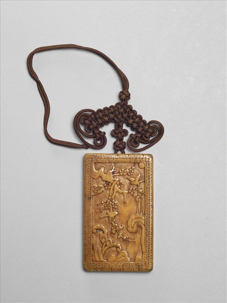 長方形器背略隆起,四周起棱,稜線上陰刻二道細線;正面四周邊框上陰刻朵花紋,內圈有一圈細棱,框內減地浮雕一自左上角橫生的梅幹一枝至中央下垂,枝幹上梅花點點,一鳥自右方翔來,一鳥立於下垂的梅枝上,此二鳥似喜鵲;下方簡地浮雕壽石與靈芝;一輪明月掛於右上角。此紋飾寓意:「喜上眉梢」。牙牌上方窄側邊正中央有一組鼻穿,可供繫掛。全器因長久盤玩,已呈褐黃色。