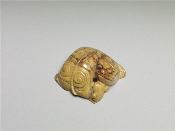 全器雕成一立體臥獅,昂首回望,背隆起,底面正中凹成一槽,四肢僅分左右,不分前後。獅首頂部一道斜深凹痕,似為誤刻。器已呈牙黃色,尾與頜下相連,邊有一孔,可供繫掛。