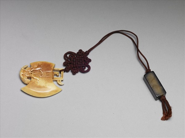 全器作一斧頭形狀,上下兩端皆突出紋飾,一作鏤空回紋,並歧出一尖角形狀;一作枝幹形狀。斧頭中央兩面皆減地淺浮雕一列回紋為飾。器一面已呈褐黃色,另一面尚為牙黃色。頂端鏤空回紋處繫一褐絛,貫穿一灰黑長方形玉石並繫一盤長結。