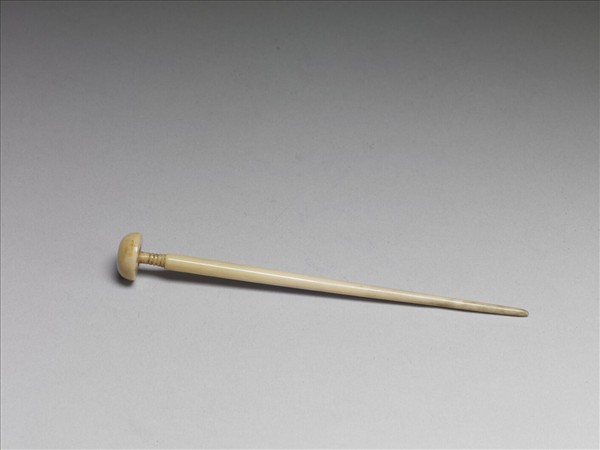 挺呈長椎形,一端銳尖,另一端凹下,並刻弦紋數道;另取一小塊象牙,雕琢成扁半球形,平底下鑿一小孔,套在挺端成簪首。