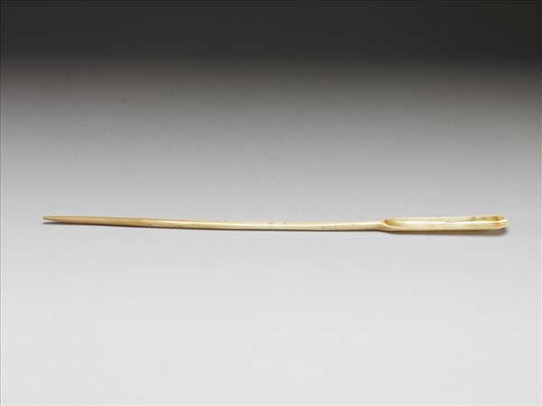器呈長椎形,一端銳尖,一端琢成修長橢圓勺形,乃用一塊長條形象牙雕琢而成。象牙已呈牙黃色,局部已染成褐色。附一裱深藍織布盒,與贈雕242、贈雕243同置於盒中。盒蓋面書「鼻煙具三事 漏斗 勺 碟也 乙亥(民國八十四年,1995)玉丁寧館藏 象齒器」並有硃紅「玉丁寧館」印。