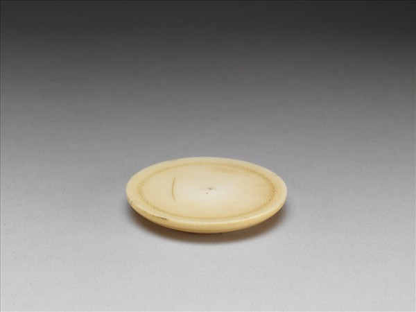 全器用一小塊象牙磋磨而成,圓形,矮圈足,圈足內中央部位另用一小塊圓形牙片嵌補。與贈雕241、贈雕242同置於盒中。