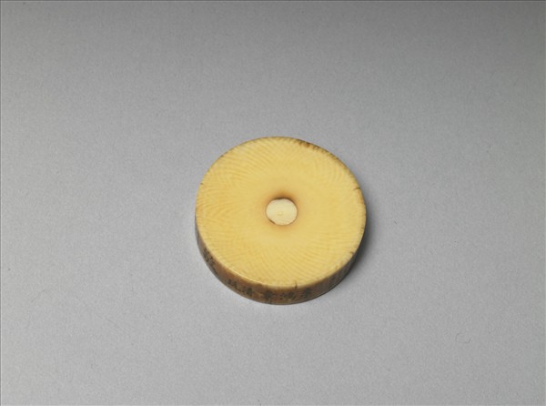 圓形厚片狀,兩面中央稍凹,中心嵌一小圓牙材,器側已呈深褐色,陰刻填金楷書銘:「敬䍩修明」,並刻款:「李鴻章清玩」。又,「敬」字銘後以微雕技法陰刻填金楷書;「敬業樂業,善之仁也。君子敬仁,足以長也。天生萬物,為吾師也。」「䍩(養)」字銘後微雕填金隸書:「攝神養和,不以樂利。滑其生術,逍遙養佛。萬象壽境,怡然自得。」「修」字後微雕填金行書:「澂心正性,學者為明。通於治亂,德本體行,風雨和甘,惟學志能。」「明」字後微雕填金篆書:「天高極遠,群星如眾。為政以德,積道民頌。觀象通乾,宇環明清。」