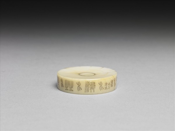 取一段牙材琢磨而成,器中央原有孔,另截取一小塊牙材填實。器側壁淺陰刻並填黑料篆書銘:「麟之趾,振振公子,吁。」楷書款:「任頤伯年清玩。」每一篆字與楷款之間刻飾(並填黑)一篆體「□」字。器略呈牙黃色,有璺。篆體詩句乃取自《詩經˙周南˙麟之趾》,原詩云:「麟之趾,振振公子,于嗟麟兮;麟之定,振振公姓,于嗟麟兮;麟之角,振振公族,于嗟麟兮。」任頤為清晚期海上派名畫家,生於清道光二十年(1840),卒於清光緒二十二年(1896);或作西元1841-1895年。