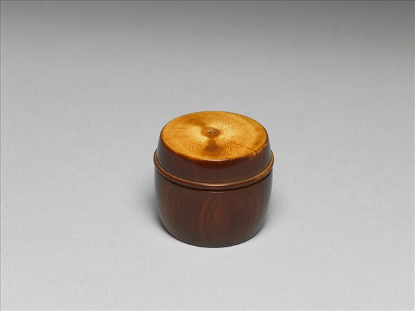 圓形,平頂,平底,子母口,蓋與盒身分由兩塊象牙製成,蓋緣有一圈突稜為飾,餘皆光素。器側外壁已染成深褐色,頂、底與蓋內壁呈淺褐色,盒身內壁仍呈深褐色。