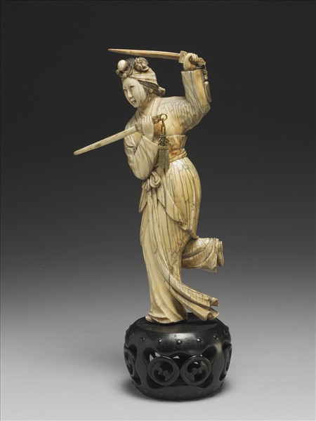 以整塊象牙立雕一單腿站立之平民仕女,頭包布巾,身穿勁裝,雙手各舞一劍,右手劍穗仍玲瓏活動,髮絲歷歷清晰,並染成黑色。此器雕工熟練,人物生動,姿態嫻雅,乃一件不可多得之傑作。舞劍仕女立於一圓墩式木座上,更見匠心獨運。全器頗見傷璺,可知曾經長期陳設。