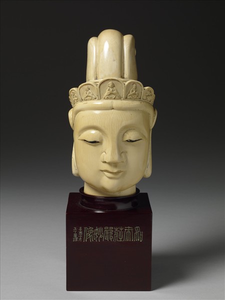 取實心牙材,略仿唐代佛教造像雕成,高髻,垂耳,戴七葉冠,冠上有三坐佛,慈眉垂目,寶像莊嚴。