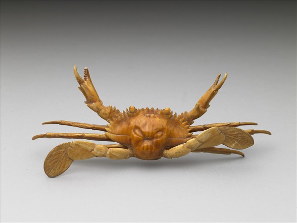 全器用一整塊象牙雕製而成一隻螃蟹,蟹腳橫伸,雙螯上舉,栩栩如生。因時常盤玩,已呈黃褐色。