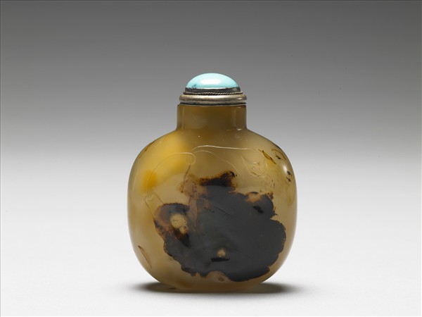 灰、黃間雜褐色瑪瑙製鼻煙壺,全器為圓直口,扁腹,平底。器身一面巧雕圖案,另一面光素無紋。帶綠松石蓋與金屬匙。