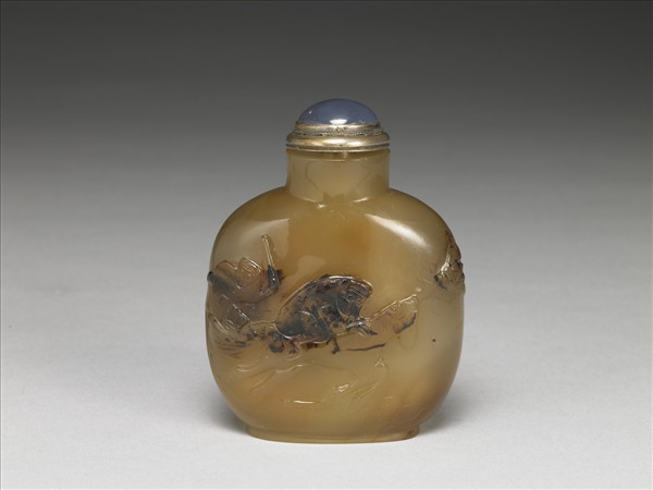 灰、黃間雜褐色瑪瑙製鼻煙壺,全器為圓直口,扁腹,橢圓足。器身一面雕刻兩猴,一猴手中舉棒,一猴騎乘於快速奔馳之馬上。因「猴」音同「 侯」,故取其「馬上封侯」之吉祥意涵。猴與馬身紋路皆雕刻細膩。另一面光素無紋。帶藍灰玻璃蓋與金屬匙。