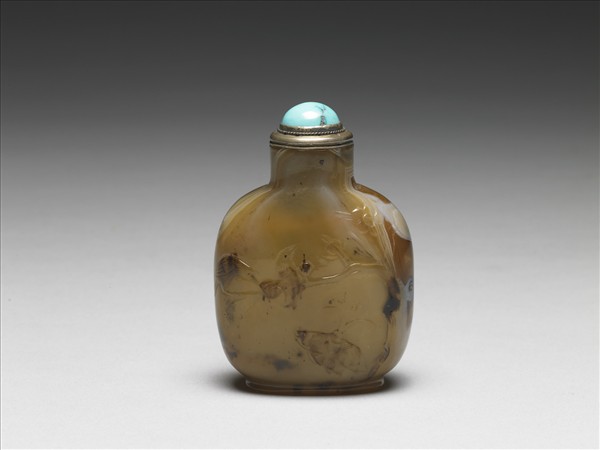 灰、黃間雜褐色瑪瑙製鼻煙壺,全器為圓直口,扁腹,橢圓足。器身一面巧雕枝幹崎嶇糾結之梅樹,樹上帶多朵含苞與盛放梅花。梅樹底下帶一展翅蝴蝶。另一面光素無紋。帶粉藍料石蓋與金屬匙。