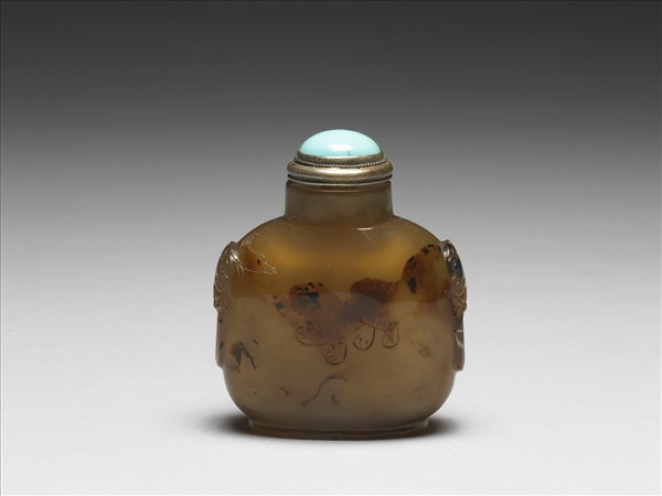 灰、黃間雜褐色瑪瑙製鼻煙壺,全器為圓直口,扁腹,橢圓足。器身一面巧雕一幼小獸,似為虎、豹之屬。器身左上方刻一鳥頭與其相對望。另一面光素無紋。器身雙側皆浮雕幾何紋與掛環圖案。帶粉藍料石蓋與金屬匙。