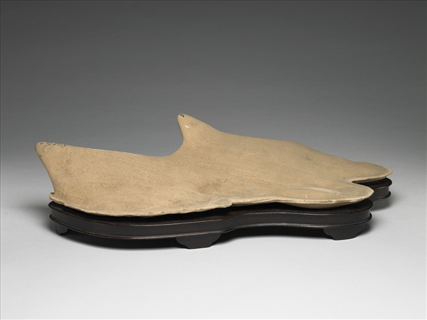 灰白色奇石一件,呈不規則形,底部稍平,上方帶兩尖形突起。奇石表面帶綿延曲折之紋理,實則為粗糙質感。底部帶一依石頭造型雕刻而成之深色木座。木座光素無紋。