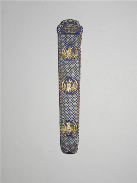 一面為白色綢布,一面為藍色綢布,上寬下窄,袋口做如意雲紋造形,以釘線繡製作圖紋,袋口繡三個如意雲紋,袋身有三圓形開光,內繡仙鶴紋,鶴身為銀色,翅膀為金色,並以藍、紫繡線裝飾,隙地作古錢紋錦地,圖案皆以各色繡線外框金色繡線製作,使色彩豐富多元,金光燦爛。外緣以藍白色格紋綾布緄邊,兼具裝飾與固定保護的效果,底部並加一藍色圓形布塊以增加承重度。