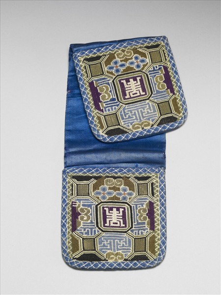 折疊式之褡褳袋,以米色棉布為裡,藍色緞布包覆兩面為表,一面中央有開口,兩側各有一黑色蟲止;兩端正反面各有一口袋,一側可反折使兩口袋上下並列,吊掛於腰帶上。袋面縫綴一數紗繡織品,以四角形與六角形組合構圖,中間為一壽字,旁邊圍繞花朵、卍字紋等幾何圖案。