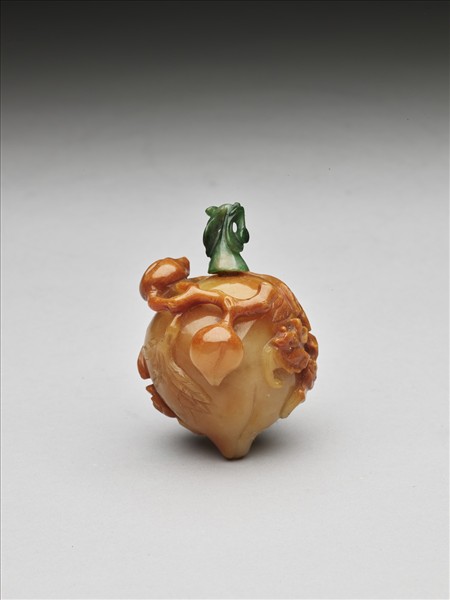 黃褐色瑪瑙,全器作桃實形。外壁浮雕蝙蝠五,間飾桃實、枝葉。壺蓋為翠玉、帶牙匙。