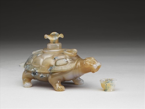 全器作立姿,四足直立、欲向前行之狀。背刻龜殼紋,中有一孔。孔周邊盤旋一8字形蛇紋,蛇首朝前。孔上有一中空圓柱,柱頂蓋作荷葉紋,中有一小孔。頭部下有一小注杯,用以盛水。