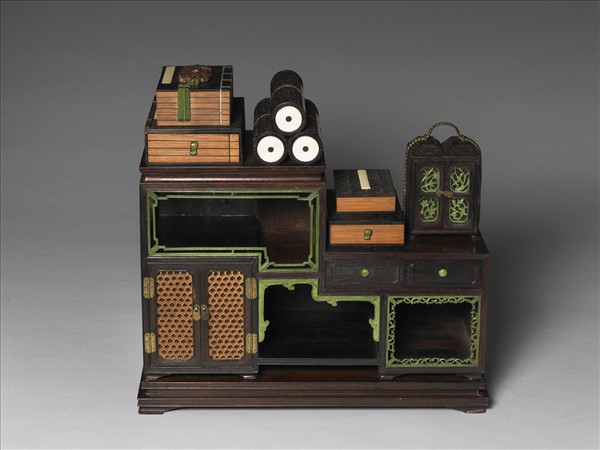 紫檀木作成書几櫃形,几窗邊緣鑲以染骨,並有拉門。最上層飾有大小重疊兩書函及三個手卷模型,次層亦飾大小兩書函,其旁有一提盒,下設有二屜。與贈雜61為一對,此兩件多寶格係作對稱式,皆屬空格子,並無放置珍玩。