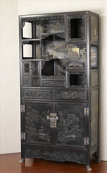 以紫檀木作成,櫃中段有二屜。屜上端有不同形式格子,格子邊緣鏤空雕四季花卉。下端為櫥,櫥門面浮雕山水人物。櫃內外壁皆描金及彩繪山水人物故事,鎖及合葉皆以掐絲琺瑯作成。