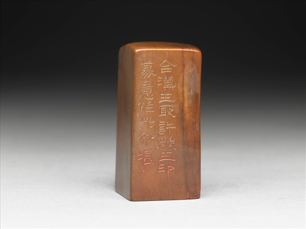 略石化之象牙章,印面正方,色橙黃,天然紋理清楚。印面陰刻四字篆文「張爰之印」。邊款「合漢王冣許敞玉印篆意作此。介堪」。本印為方巖所治。