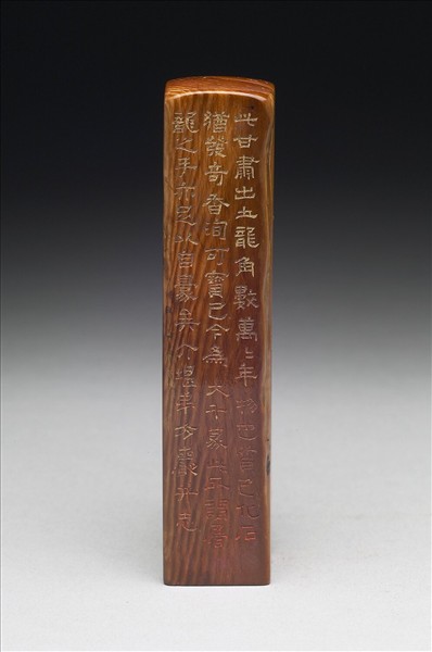 略石化之象牙章,印面正方,色橙紅帶棕,天然紋理清楚。印面陽刻三字篆文「大風堂」,印文作鳥蟲篆,婉曲繁複。邊款「此甘肅出土龍角,數萬萬年物也。質已化石,猶發奇香,洵可寶已。今為大千篆此,所謂屠龍之手,亦足以自豪矣。介堪弟方巖并志」。本印為方巖所治。