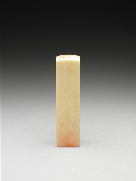 象牙質章,印面方正,色月白。印面陰刻四字篆文「張爰私印」。頂款「立夫仿漢之作」。本印為頓立夫所治。