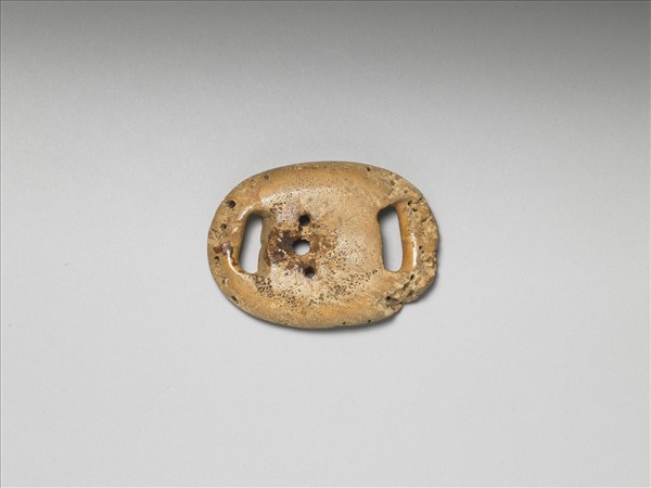 取獸骨磨成橢圓厚片狀,兩端各鑿一長方孔,近中央部位又穿三孔。全器有傷損,且局部已略石化,另外亦有細碎石質侵入疏鬆骨質空隙的部分,故入手甚沉。此器長方孔內近器緣之長邊,因長期使用而磨得較平滑,中央三孔原可能插入針鈕等零件,已扣繫腰帶。此器已略石化,其製作時代應相當早。