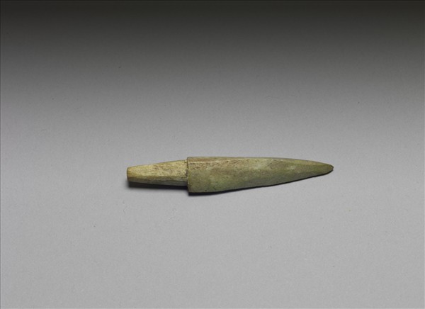 鏃身呈等腰三角形,剖面亦呈成等腰三角形,圓錐形柄,但末端截平,鏃尖尖銳。器表面仍遺留製作時的切磨痕,且多已染成綠色。商周時代雖已進入銅器時代,銅兵器相當常見,但因價昂,骨鏃依然可見。
