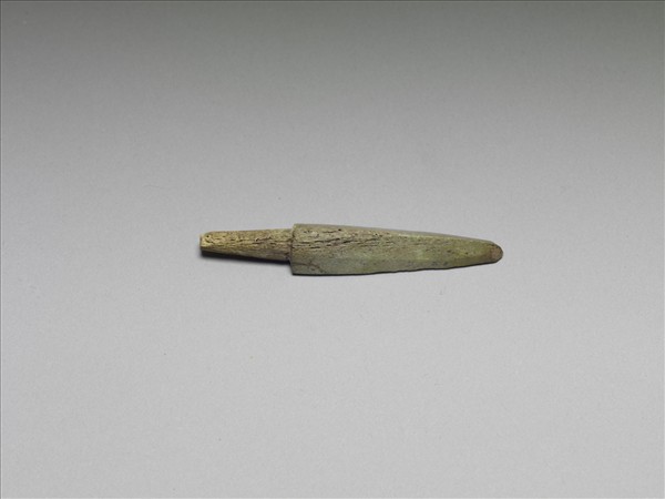 鏃身呈等腰三角形,剖面亦呈成等腰三角形,圓錐形柄,但末端截平,鏃尖傷鈍。器表面仍遺留製作時的切磨痕,且多已染成綠色。商周時代雖已進入銅器時代,銅兵器相當常見,但因價昂,骨鏃依然可見。