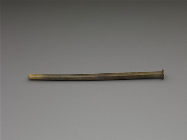長條形,一端扁平如傘蓋狀,器身剖面呈圓形,但另一端仍顯露牙黃色外,幾乎全染成墨綠色。似此如傘蓋狀之髮飾,在屬於商晚期的殷墟小屯村即曾出土,至於陝西長安灃西張家坡西周遺址,以及新旺村西周製骨作坊遺址中所出土為數不少的骨笄裡,也有這類形器;陝西鬥雞臺溝東區漢代墓葬中也曾出土類似髮簪,但平頂狀傘蓋較向外伸展;在揚州唐城手工業作坊遺址出土的骨簪,簪首雖然也作傘蓋狀,卻呈圓頂,而非平頂。