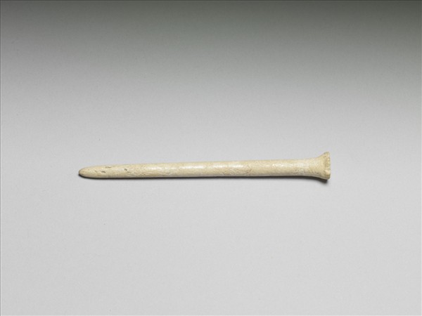 長條形,一端鈍尖,一端平頂如傘蓋狀,剖面呈圓形。器表傷蝕,笄首傷缺。似此笄首如傘蓋狀之髮飾,在屬於商晚期的殷墟小屯村即曾出土,至於陝西長安灃西張家坡西周遺址,以及新旺村西周製骨作坊遺址中所出土為數不少的骨笄裡,也有這類形器;在揚州唐城手工業作坊遺址出土的骨簪,簪首雖然也作傘蓋狀,卻呈圓頂,而非平頂。