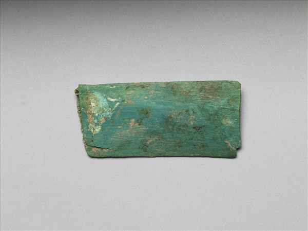 全器乃骨片之原形,因無人類加工痕跡,無法確知其時代,但依全器已染成銅綠色,墓葬中可能埋有不少銅錫合金器。據瞭解,此物發現時置一漢鼎中,此鼎中同時尚有不少殘骨,或為祭典中殘留物。