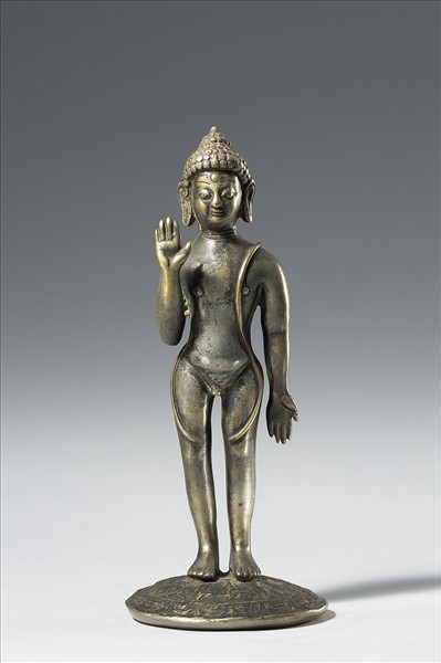 銅佛立像,此像頂有肉髻,眉間有白毫,臉型圓鼓,鼻準豐厚,人中短,唇厚,項有三道環紋;全身赤裸,僅自左肩斜掛一條巾帶,立於一圓形銅座上,座有蓮瓣紋邊飾。右手向上作無畏印,左手向下施與願印,為一尊誕生佛像。為印度喀什米爾作品。