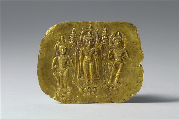 本件是金屬敲花(Repoussé)作品,用鎚子在金薄片上敲打出一佛與二脇侍菩薩的圖案。自西元八世紀以來,以金屬敲花技法製作淺浮雕效果的奉獻金片,在東南亞泰國、柬埔寨等地相當盛行。本奉獻金片之主尊佛站在蓮臺之上,雙手皆作說法印,頭頂肉髻,披通肩袈裟,四周有火燄形背光。左右脇侍菩薩亦立於蓮臺上,手中各持一舍利塔,此兩尊脇侍菩薩雖無瓔珞裝飾,但髮上有高髻,未著袈裟而穿通肩式覆肩衣。佛與菩薩薄衣貼體,衣無褶痕,露出肚臍及腰線,是笈多王朝(4-6世紀)佛像的影響。主尊兩側雙塔住於空中,則是來自東印度比哈爾的構圖樣式。尊像頭部比例過大,與身體並不相稱,但其面貌、身體結構,以及主尊立佛雙手均作說法印,是泰國在六至十世紀墮羅鉢底(Dvaravati)時期佛教作品特徵。墮羅鉢底是蒙族(Mon)在六世紀末於湄南河一帶建立的王國,篤信上座部佛教,民族具有額寬臉闊、面短鼻塌、高顴骨、嘴巴寬等人種特徵。此外,三尊像的雙手同時曲肘姿態、三莖並蒂蓮臺座等亦是泰國本地特徵,由此可見泰國在印度化過程中,本地風格發展的歷程。