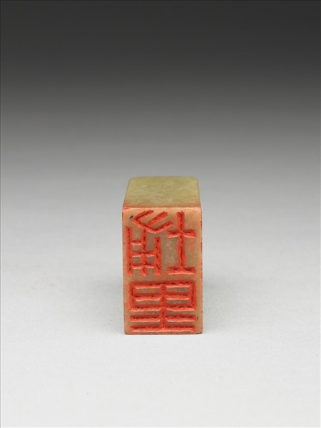 扁長方體青田石印,青白色,印頂弧角,外壁光素無紋。印面長方,江兆申刻白文:「埔里」單行二篆字,線質如硬豪寫篆,但更近筆法樸拙一類的隸書書風,如「里」字幾乎篆隸難以嚴格區分,整體風格如執筆直書印面,未見畫面與線質上刻意經營的痕跡,展現相當自然的風味與品調。邊款刻「辛未兆申篆」。辛未為民國八十年(1991),此年九月江兆申方自國立故宮博物院退休,並移居南投埔里,故此印當用以記此事而作者。