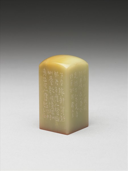 長方柱形青田石印,青色,印頂弧起,外壁光素無紋。印面正方,江兆申刻白文:「不恨古人吾不見」三行七篆字。邊款刻辛棄疾〈賀新郎-邑中園亭,僕皆為賦此詞。一日獨坐停雲,水聲山色競來相娛,意溪山欲援例者,遂作數語,庶幾彷彿淵明思親友之意云〉詞前段,並自識:「兆申乙亥」,印文內容取詞中「不恨古人吾不見」一句,除呈現閱讀辛棄疾詞作而被激起的奮發高情外,還隱藏了自得己身成就的雄視之氣,故以「不恨古人吾不見」為印文,實指向「恨古人不見吾狂耳」。乙亥為民國八十四年(1995)。此印與「茮原」、「雙菩提樹龕」、「茮原藏拓」、「江左沉酣」四印(贈雜000215-000219)共盛一錦盒中,盒外題籤:「閒文齋館表字收藏諸印」。