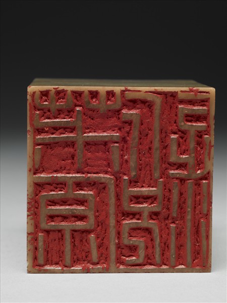 長方柱形青田石印,青色,外壁光素無紋。印面正方,江兆申刻朱文:「茮原近況」雙行四篆字,朱文線條多見硬直,筆畫布排寬綽,如等距羅列於印面,展現大巧不工的氣勢。據杜三鑫的說法,此印當於任職國立故宮博物院時所作,與另件「江兆申印」(贈雜000221)白文印成對。