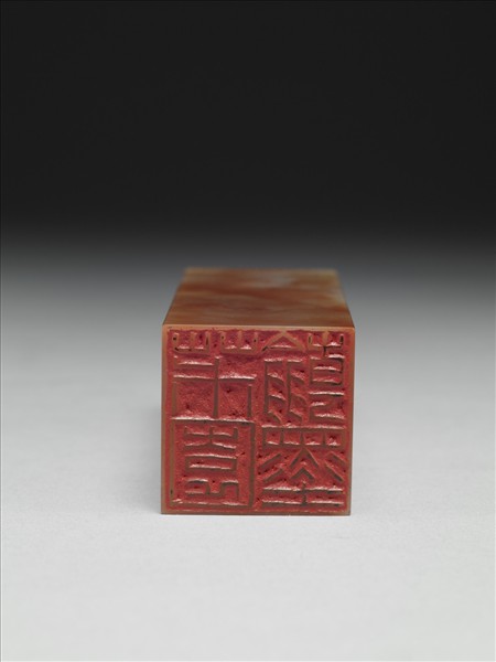 長方柱形巴林石印,紅白黃相間雜。外壁上緣幾何三角連續紋,其中刻有一方形框,框內刻「丙辰」二字。印頂呈平面,上刻獸面紋飾。印面正方,江兆申刻朱文:「茮園翰墨」雙行四篆字結字方,用筆簡省方拙,略見減省筆畫的設計感。邊款刻:「壬申臘月兆申自製對印。庶乎餘勇猶可賈耶。」與「江兆申印」白文印(贈雜000227)成對。壬申為民國八十一年(1992),此時江兆申方自國立故宮博物院退休後不久,重拾兒時賺取家用的舊技,且方在職故宮時,未能全心專意於篆刻,故面對雕鈕華美的印石,不免有此「近鄉情怯」之嘆。附錦盒,其上題籤:「博古泰來對章,子昭製,心白」。黃嘗銘,字子昭,故知此對印鈕為黃嘗銘所製作。