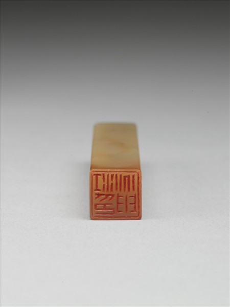 長方柱形巴林石印,白褐相間而略透,印頂弧起,外壁光素無紋,印面邊緣有傷。印面正方,江兆申刻白文:「江兆申印」雙行四篆字白框,佈局方整,筆畫形貌自然而無刻意或規格化的痕跡。與「原父」朱文印(贈雜000240)成對。