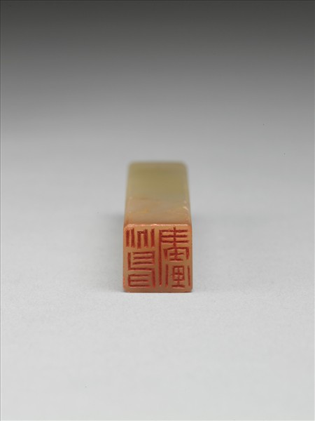 長方柱形巴林石印,白色透褐,印頂弧起,外壁光素無紋,邊稜有微傷。印面正方,江兆申刻白文:「兆申畫」雙行三篆字,豎筆拉長,線質飽滿,「畫」字似上下方分離,又以長豎統一,章法別具趣味。本印與「無聲之詩」朱文印(贈雜000242)成對。