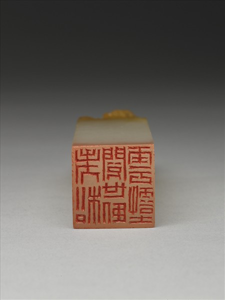 壽山石印,色白,乳濁而略透,長方柱形印鈕部分橘黃色,雕一仙翁。仙翁禿頂笑顏,長眉及膝,手持麈尾,麈尾尾端披於身後,其長眉的特色,與浙江聖因寺貫休名下的十六羅漢之一有相似處。印面正方,江兆申刻白文:「老松閱世臥雲壑」三行七篆字,較之江兆申其他作品,此印結字布排較隨意,線質不求飽滿或蒼勁的經營,筆畫兩端亦不刻意收拾,乍看如初學之作,但「隨意」與「不收拾」間,卻無草率或布排失當之處,這便是藝術家創作的另一層品質與境界了。邊款刻:「涪翁句,乙亥兆申刻。老松閱世臥雲壑,挽著滄江無萬牛。」由邊款可知印文乃取自宋代黃庭堅〈秋思寄子由〉詩中句,雖然該詩亦見於蘇軾詩集中,但江兆申認為此詩為黃庭堅之作。乙亥為民國八十四年(1995),此時江兆申已自國立故宮博物院退休。