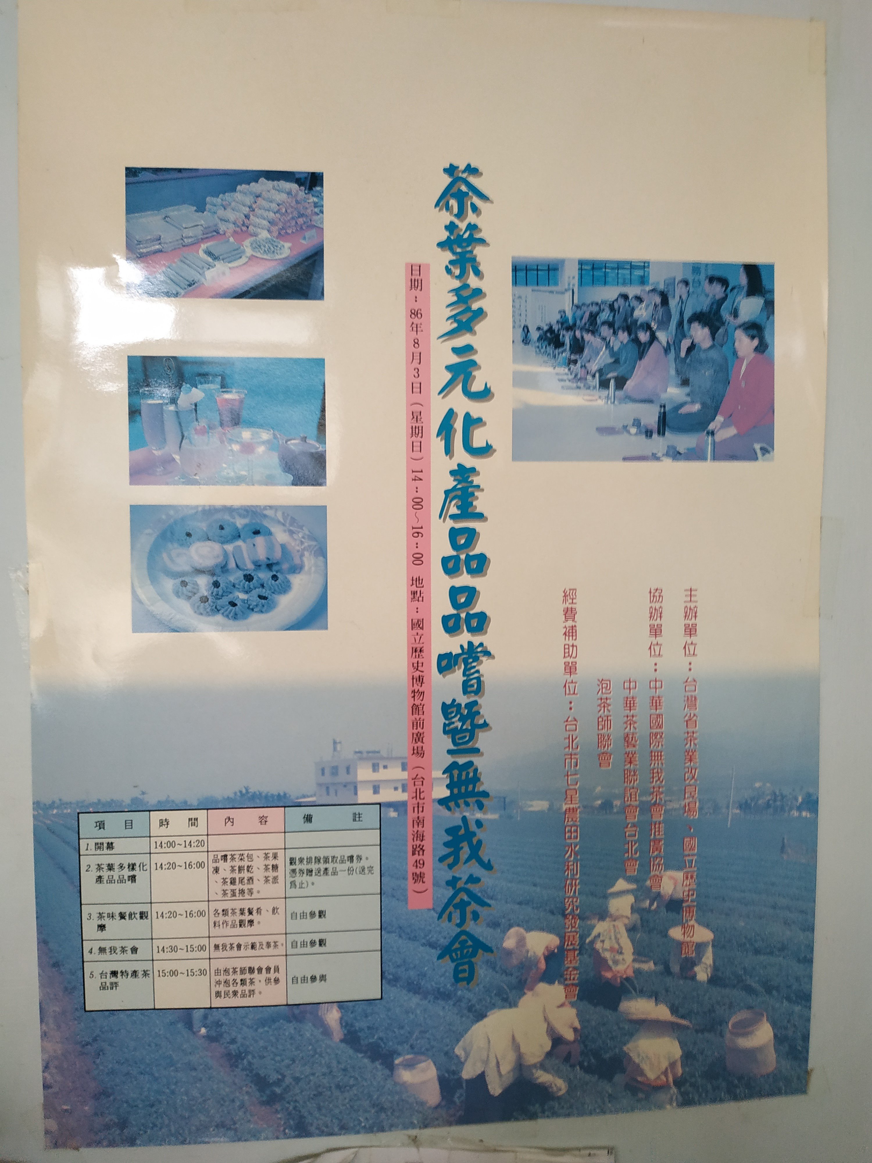 圖為國立歷史博物館自1997(民國66)年7月5日-10月1日辦理「茶的文化」特展期間,由茶業改良場會同中華茶聯台北會及泡茶師聯會,於歷史博物館廣場辦理「茶葉多元化產品品嚐暨無我茶會」活動之海報。