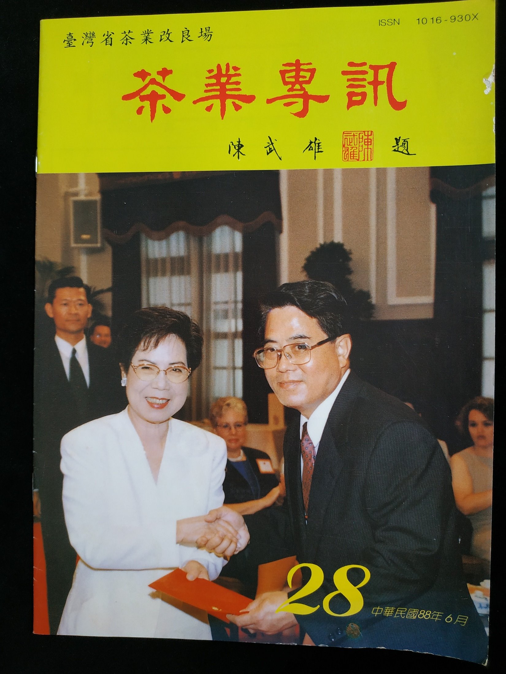 照片為茶改場出版「茶業專訊」第28期--報導該場首次配合總統府辦理茶會款待外賓,左為李登輝總統夫人曾文惠女士,右為廖慶樑場長。
