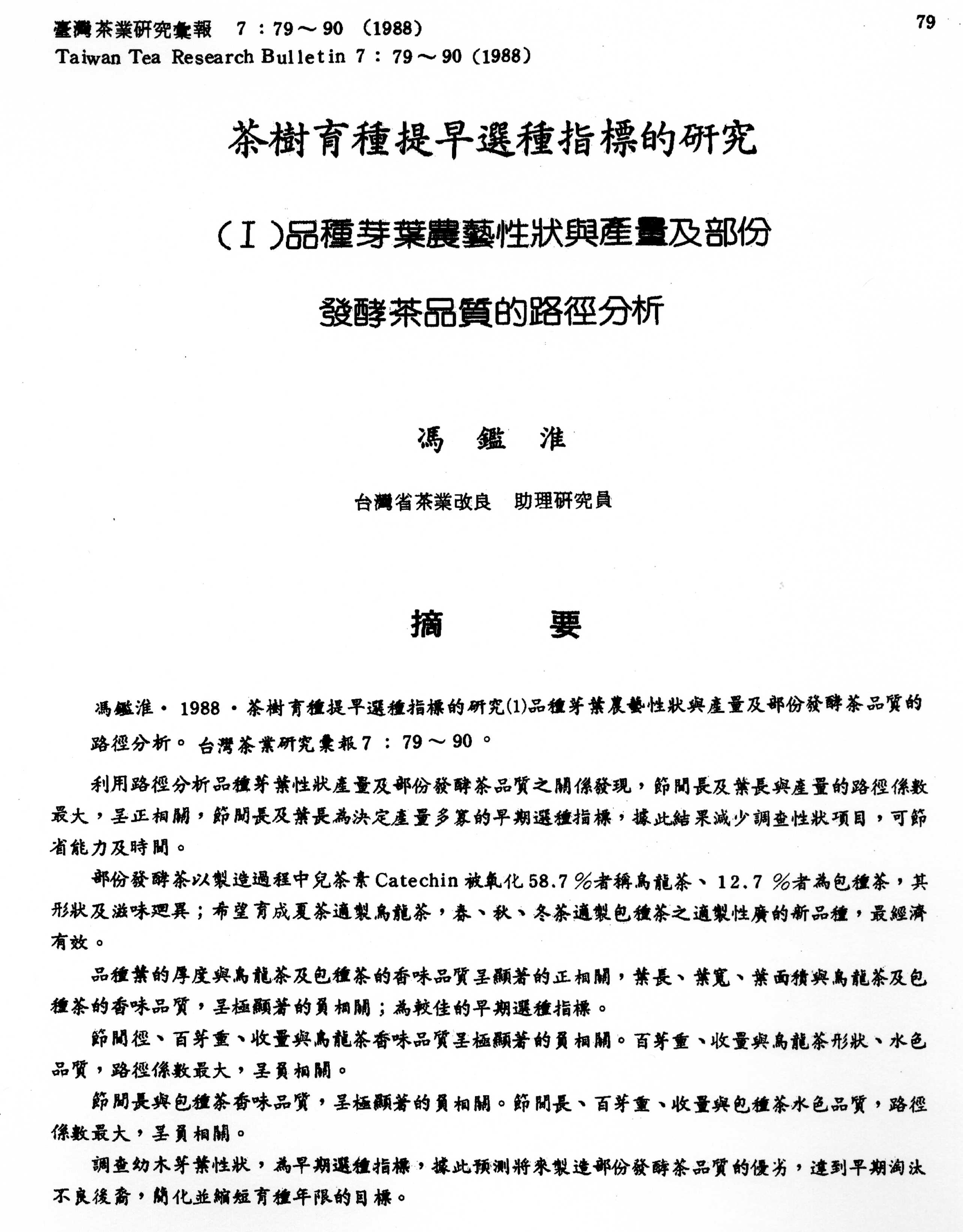 圖為刊載於臺灣茶業研究彙報7卷,由馮鑑淮與沈明來共同發表之「茶樹育種提早選種指標的研究 (I) 品種芽葉農藝性狀與產量及部份發酵茶品質的路徑分析」研究論文。
