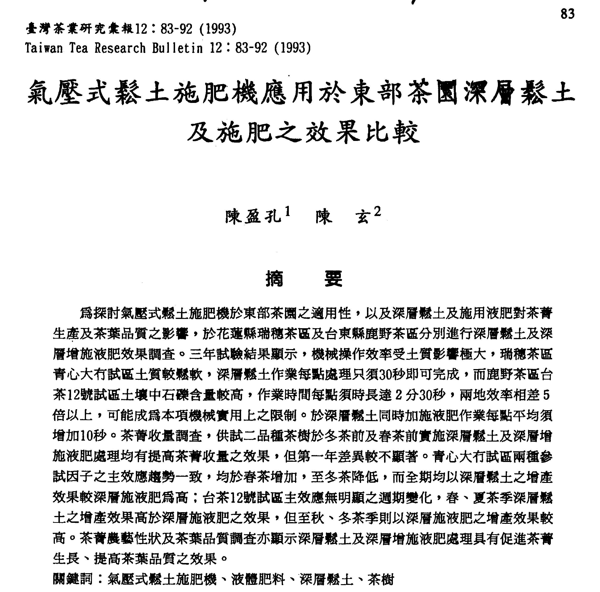 圖為刊載於臺灣茶業研究彙報12卷,由陳盈孔與陳玄共同發表之「氣壓式鬆土施肥機應用於東部茶園深層鬆土及施肥之效果比較」研究論文。