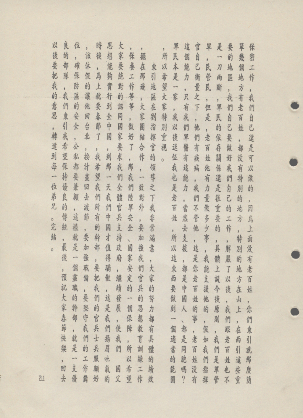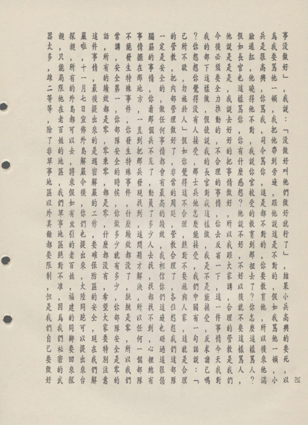 「現在我們解嚴(註1)了,11月7日宣布外島解嚴令後,你們可以提出,大陸同胞也可以提出來台探親,所有的外島都可去。講來如有東引的老百姓,福建同鄉要回來探親,只能侷限在非軍事地區,因為機密要件太多,所以必須限制。此外我們自身也要做好保密工作,東引也就那幾個地方有居民,在西引這些重要地方,我們都要站好自己崗位。戒嚴後,我們跟百姓也不是一刀兩斷,軍民依存關係仍重要,具體上說今後關係,軍管軍、民管民,但居民能有多少力量做多少事,我們能支援的還是要幫忙。軍民本是一家,退伍後我也是老百姓,所以我希望大家要做到一個適當範圍,希望大家能夠重視。」