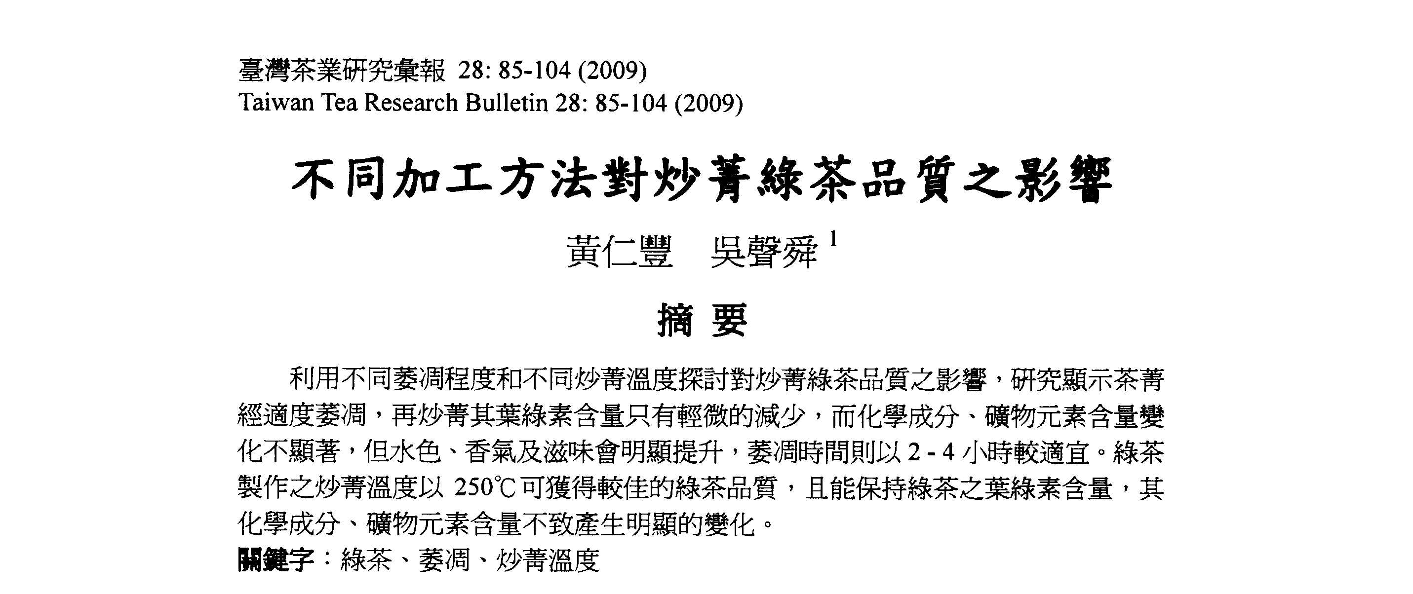 圖為刊載於臺灣茶業研究彙報28卷,由黃仁豐與吳聲舜共同發表之「不同加工方法對炒菁綠茶品質之影響」研究論文。
